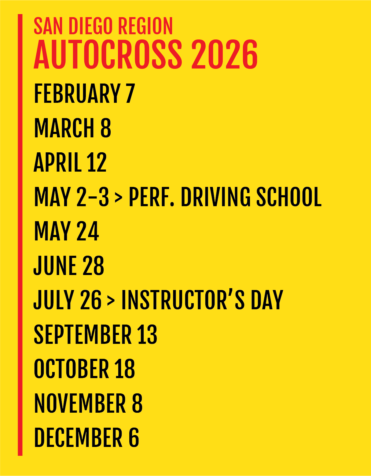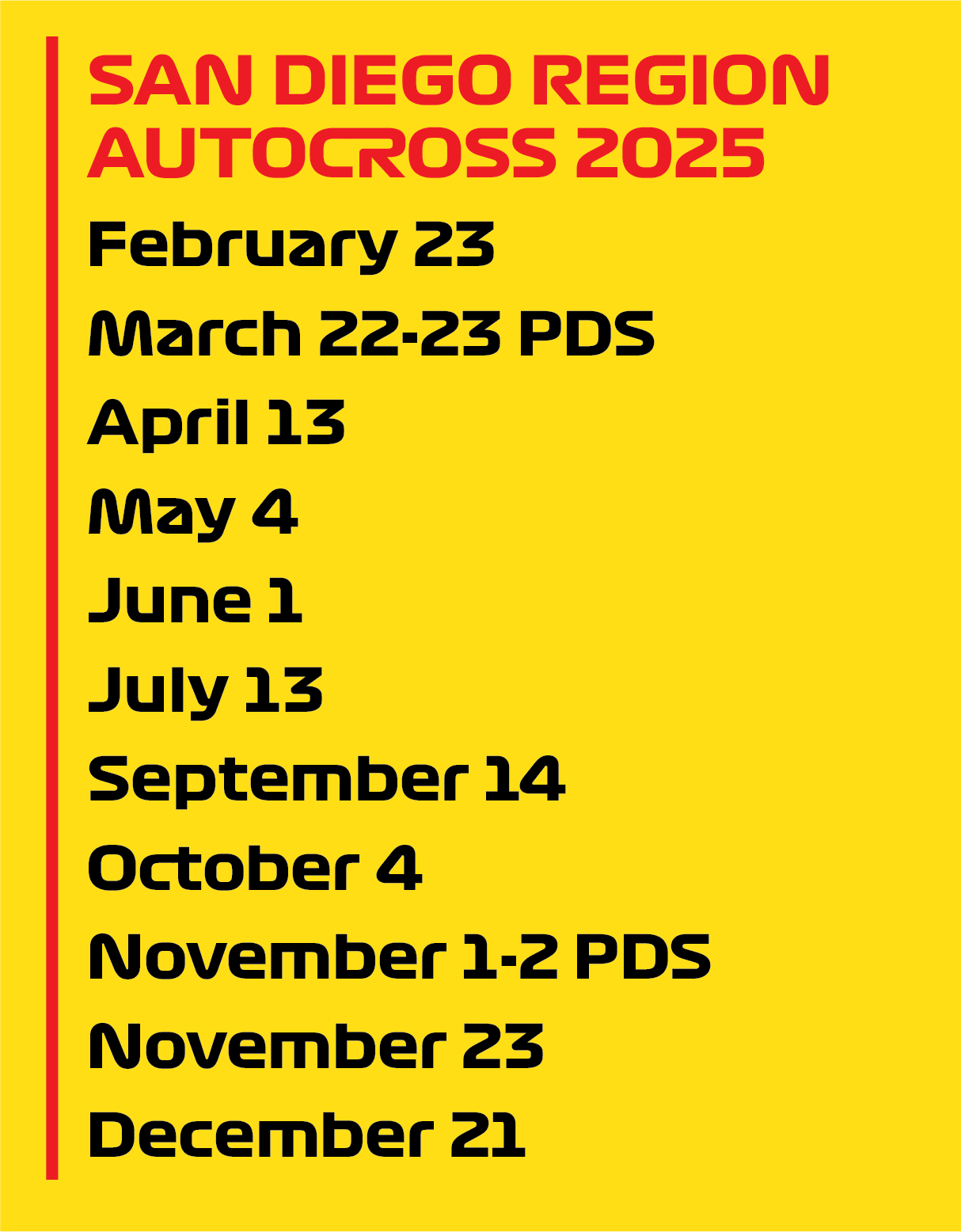An annual course, the San Diego Region’s Performance Driving School (PDS) will give you an introduction to the fine art of car control. Lessons you learn will increase your safety in road driving as well as give you a good foundation for future track and autocross driving. PDS is composed of an evening discussion of performance driving theory and two full days of driving exercises. Check out the Region Calendar for PDS in the Fall and join us! You will learn an incredible amount.